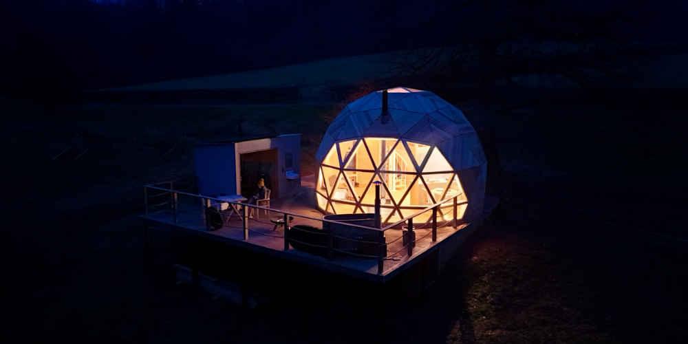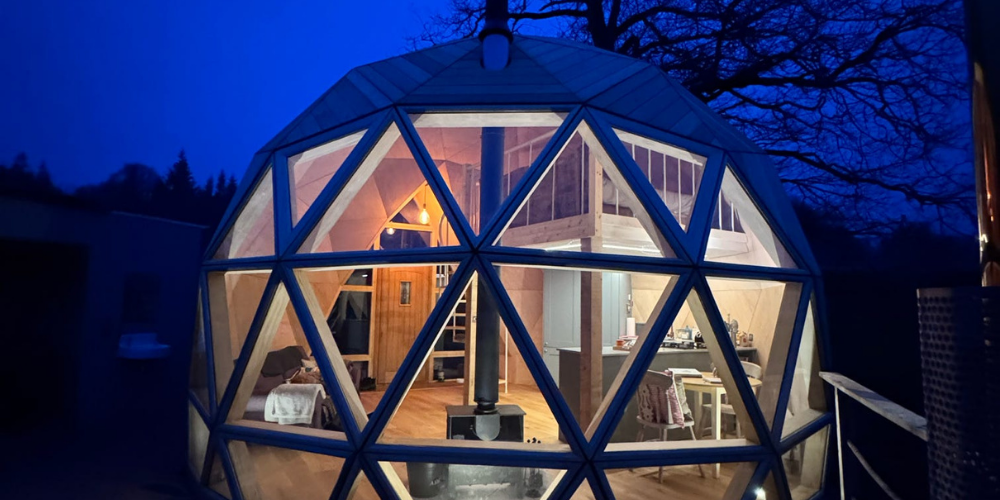 The Nova Dome sits surrounded by sprawling nature. Whilst winter might see you curled up listening to the wood burner crackle and rain pitter patter on the roof, reading books from the shelf on the sofa, summer will have you outside dining al fresco on the table, or draped over a bean bag firepit-side. There’s plenty of nature to find on these 18 acres of pasture land, from sheep dawdling in their fields, bees lazily traipsing from bluebell to snowdrop, and the babbling stream meandering throughout.