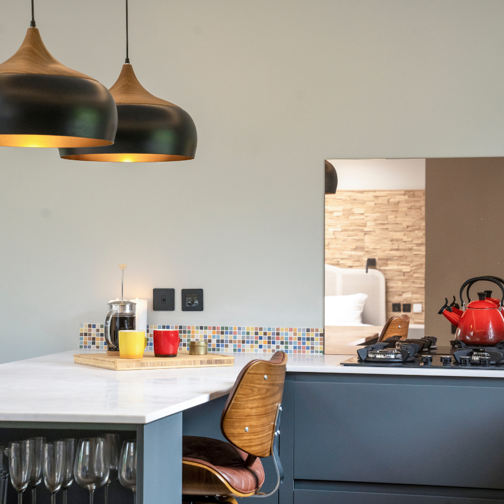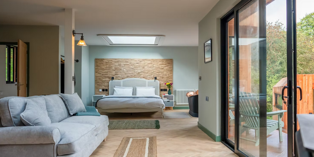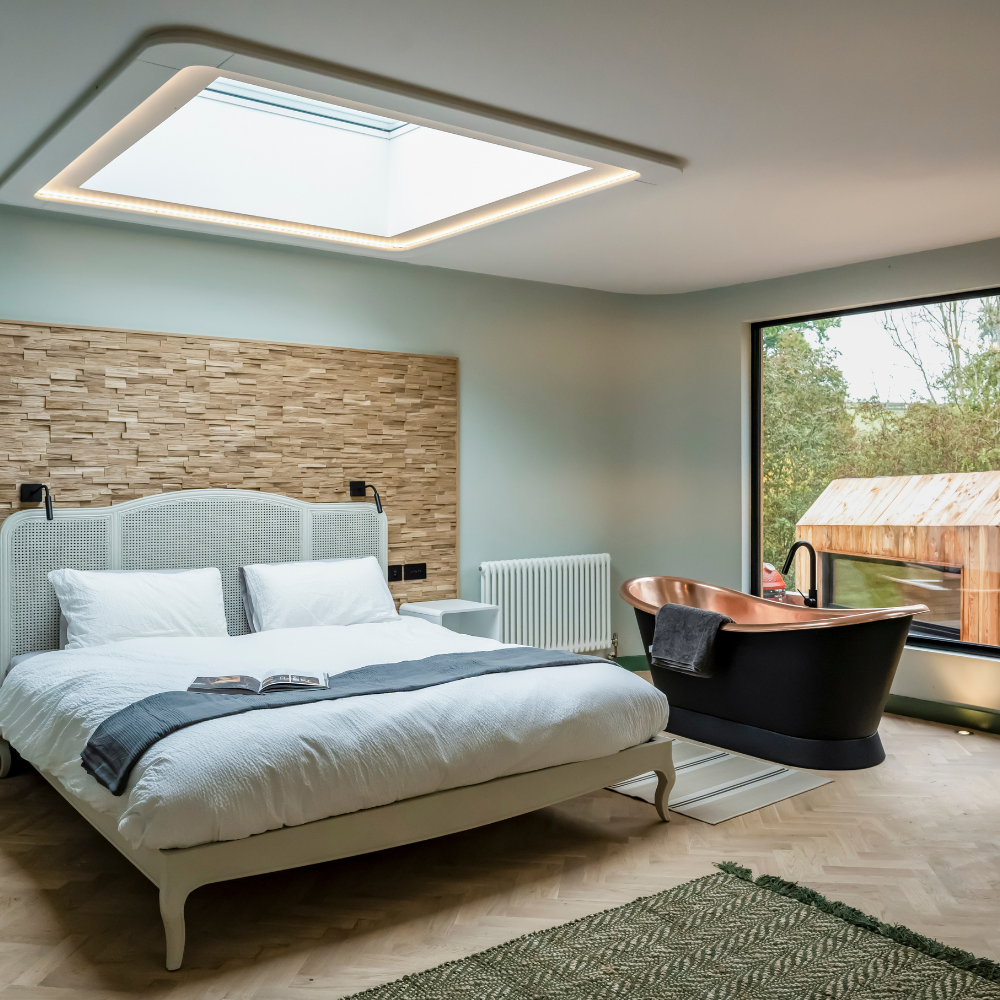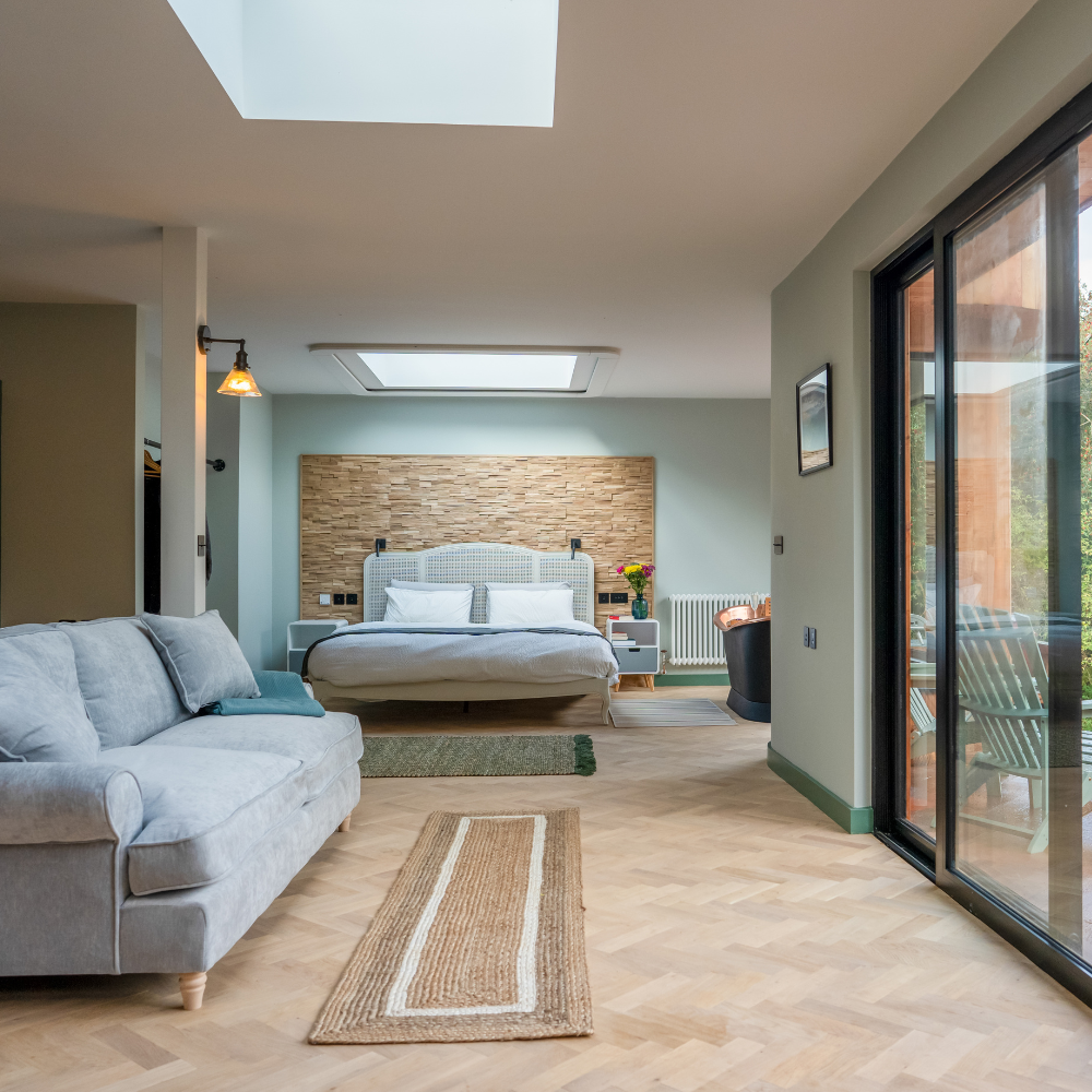 Indulge in the epitome of opulence within our luxurious cabin bedroom. As you step inside, your eyes are immediately drawn to the grand super king-size bed adorned with sumptuous linens, promising nights of unparalleled comfort and relaxation. The room’s crowning jewel is the star-gazing window, strategically placed above the bed to offer you an uninterrupted view of the night sky, allowing you to drift off to sleep under a canopy of twinkling stars. To complete the experience, a regal roll-top bath stands proudly in the corner, beckoning you to submerge in a sea of bubbles and take in the surrounding natural beauty through oversized windows. It’s a sanctuary of serenity, where rustic charm meets modern luxury, inviting you to unwind and escape the demands of everyday life.