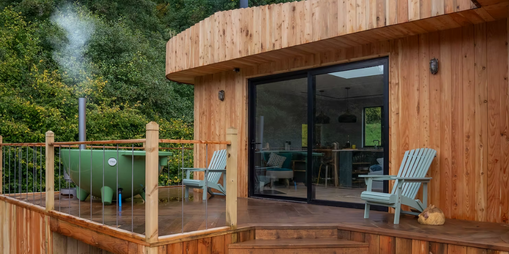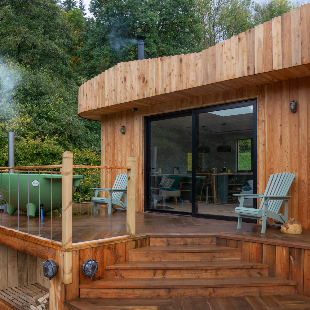 Step outside into the enchanting outdoor space of our luxury cabin, where relaxation and nature converge in perfect harmony. Perched on a private deck, you’ll be surrounded by woodland and streams, inviting you to immerse yourself in the tranquility of the wild. Your very own private wood-fired sauna stands ready to envelop you in its comforting warmth, allowing you to unwind and rejuvenate amid the crisp countryside air. Also on deck, is a wood-fired hot tub, where you can soak beneath the vast, star-studded sky. Complete with al fresco pizza oven and Kamodo Joe BBQ, this is a haven for those seeking the ultimate in relaxation, where the beauty of the natural world is the backdrop to unforgettable moments of peace and rejuvenation.