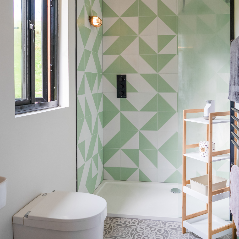 - Indoor bathroom with a modern compost loo, sink and shower.
